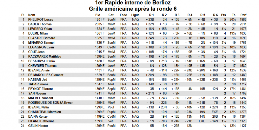 Ce samedi après midi le club à organisé son premier tournoi rapide mensuel en interne. Grace à l’engagement de tous les joueurs le tournoi s’est conclu dans une ambiance conviviale .Félicitations à Lucas PHELIPOT le vainqueur du jour .Ci dessous les résultats .