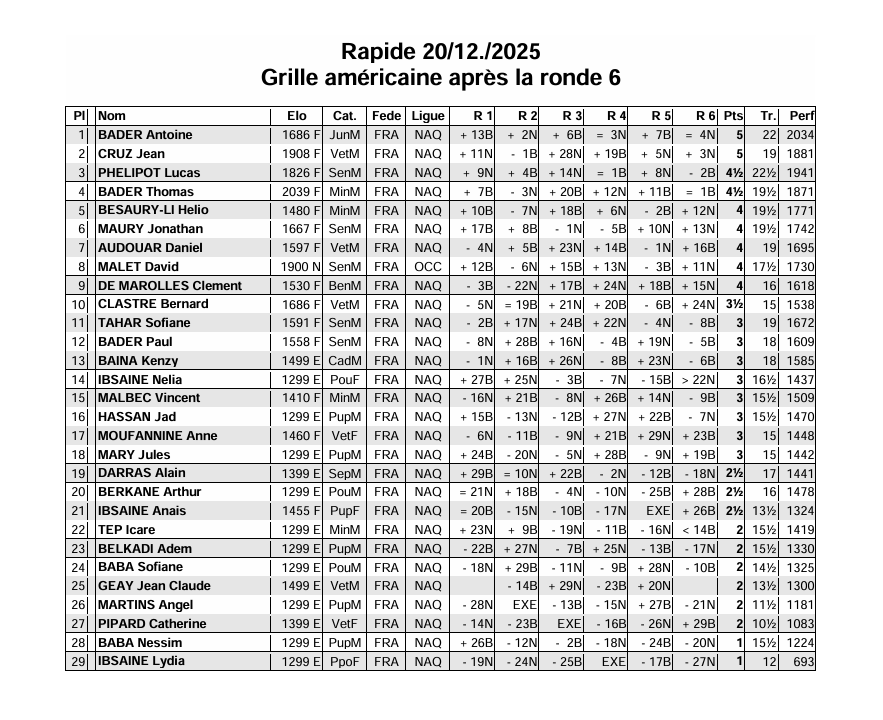 | 5 | DE MAROLLES Clement | 1530 F | BenM | FRA | NAQ | Club d’Echecs Pau Berlioz | |